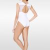 Leotard detailed in the front and back with scalloped edge lace. Cut out in upper back.
