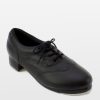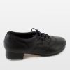 Double-soled tap shoe with soft leather and brogue stitching. Cushioned lining around the opening and throughout the inside of the shoe. Screwed on taps and rubber pads attached.